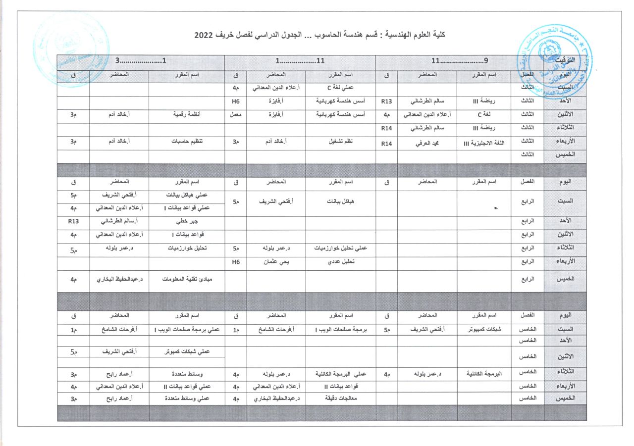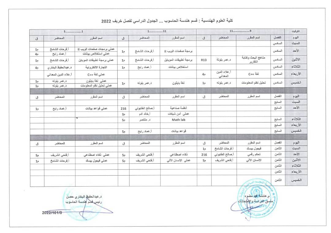 جدول المحاضرات لقسم هندسة الحاسوب (خريف 2022) بعد التعديلمكتب الاعلام12 أكتوبر، 2022الاخبار والإعلانات, الصفحة الرئيسية المقالة السابقة إجتماع كلية العلوم الهندسية لشهر اكتوبر 2022م حول الخطة الدراسية المقالة التالية المنحة الدراسية للجامعات