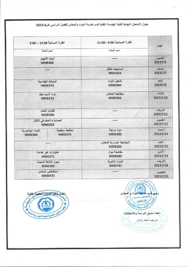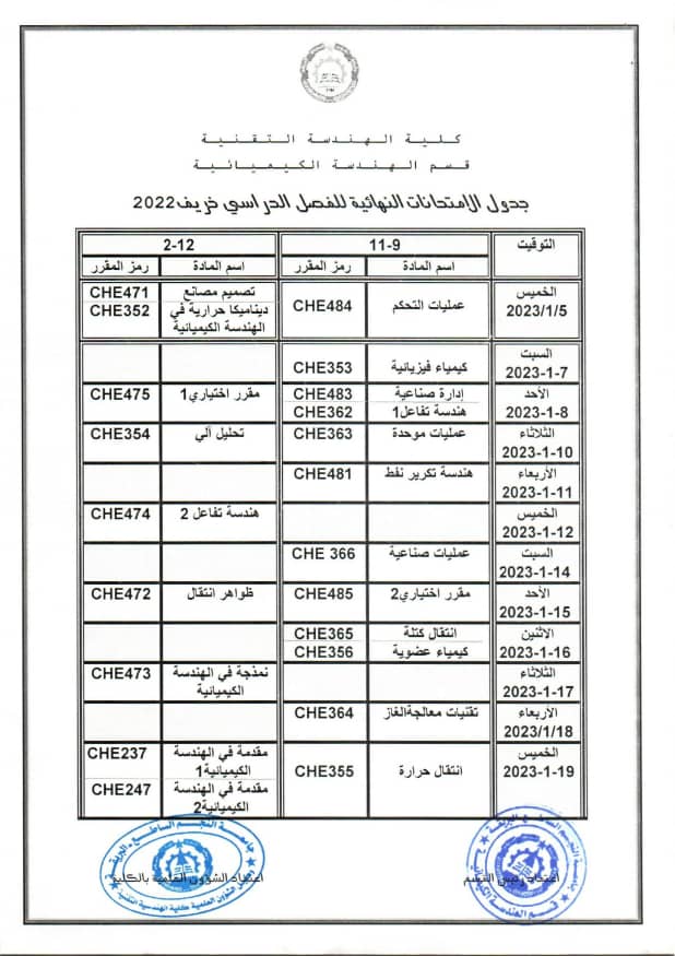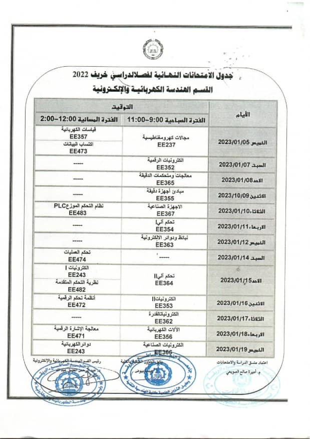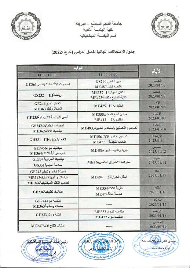جداول الامتحانات النهائية للأقسام العلمية بكلية الهندسة التقنية (خريف 2022)مكتب الاعلام17 ديسمبر، 2022الاخبار والإعلانات, الصفحة الرئيسية المقالة السابقة ورشة عمل كتابة مشاريع التخرج لقسم هندسة الحاسوب المقالة التالية جداول الامتحانات النهائية للأقسام العلمية بكلية العلوم الهندسية (خريف 2022)