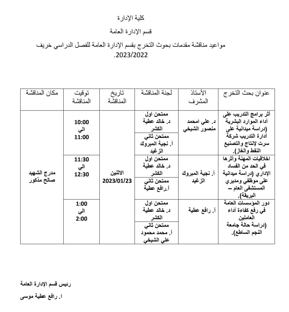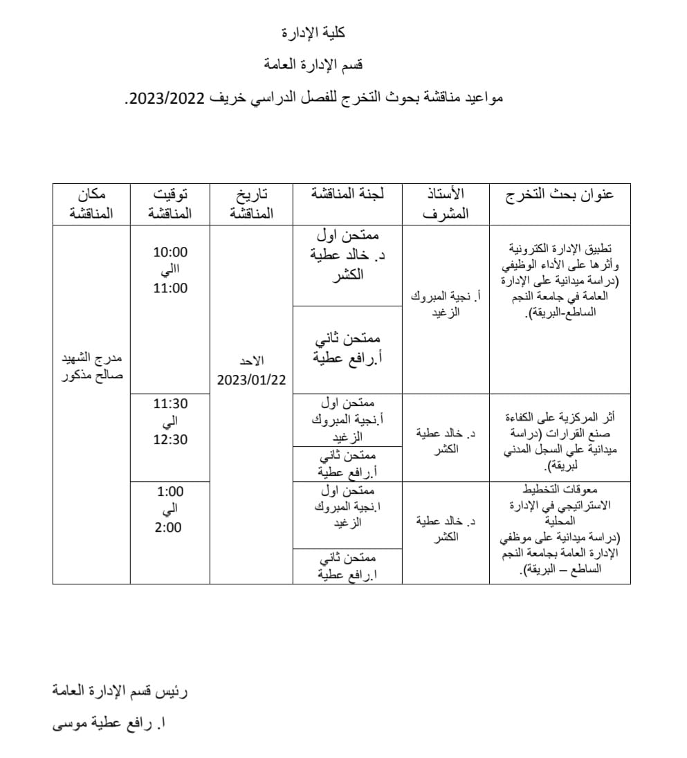 جدول مناقشات مقدمات ومشاريع التخرج لقسم الادارة الهندسية للفصل الدراسي خريف 2022مكتب الاعلام16 يناير، 2023الاخبار والإعلانات, الصفحة الرئيسية المقالة السابقة جدول مناقشات مقدمات ومشاريع التخرج لقسم الهندسة الكيميائية للفصل الدراسي خريف 2022 المقالة التالية جدول مناقشات مشاريع التخرج لقسم هندسة الجيولوجيا للفصل الدراسي خريف 2022