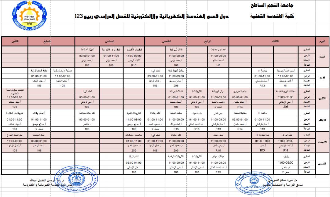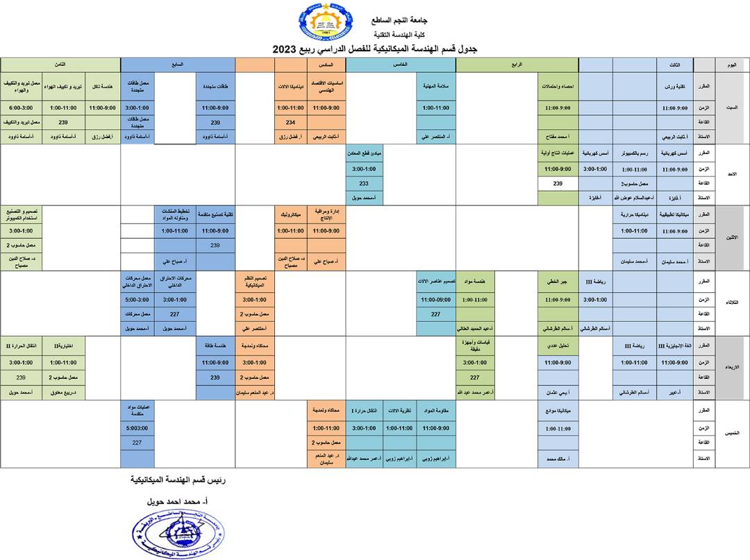 جداول المحاضرات للاقسام العلمية بكلية الهندسة التقنية للفصل الدراسي (ربيع 2023)مكتب الاعلام25 فبراير، 2023الاخبار والإعلانات, الصفحة الرئيسية المقالة السابقة تسليم شهادات إتمام دورة اللغة الانجليزية بمركز اللغات لأفراد من رئاسة الأركان الجوية المقالة التالية جداول المحاضرات للاقسام العلمية بكلية العلوم الهندسية للفصل الدراسي (ربيع 2023)