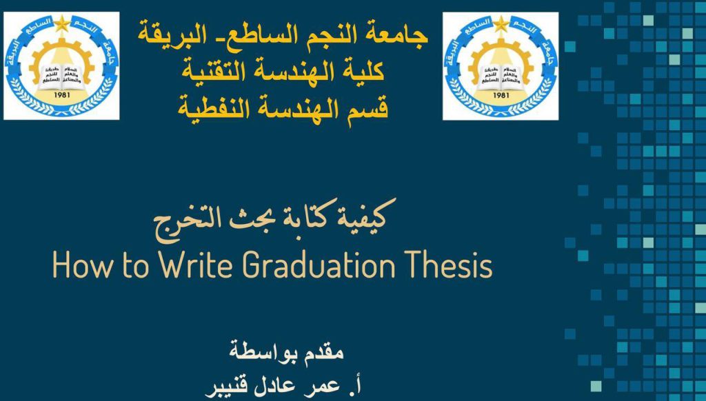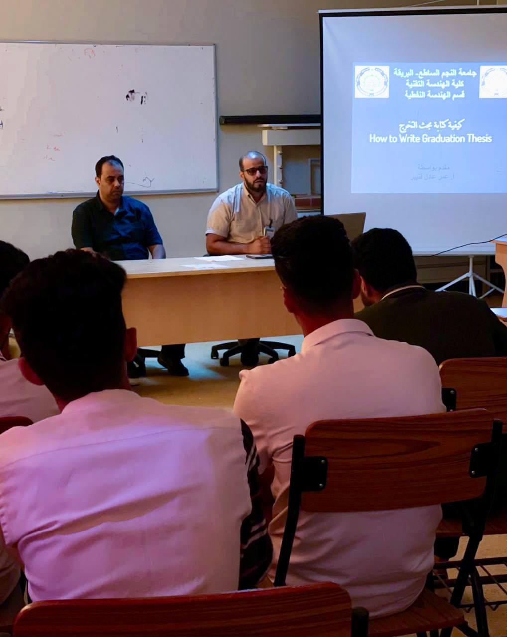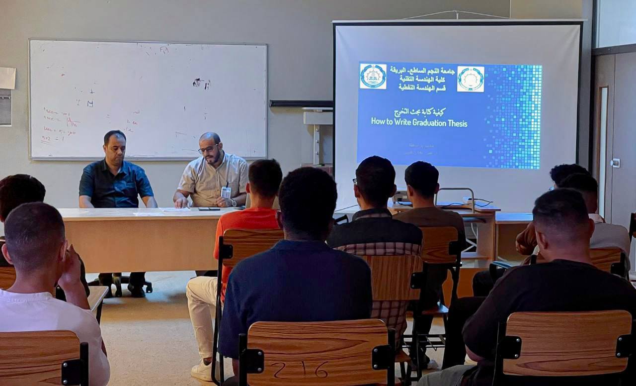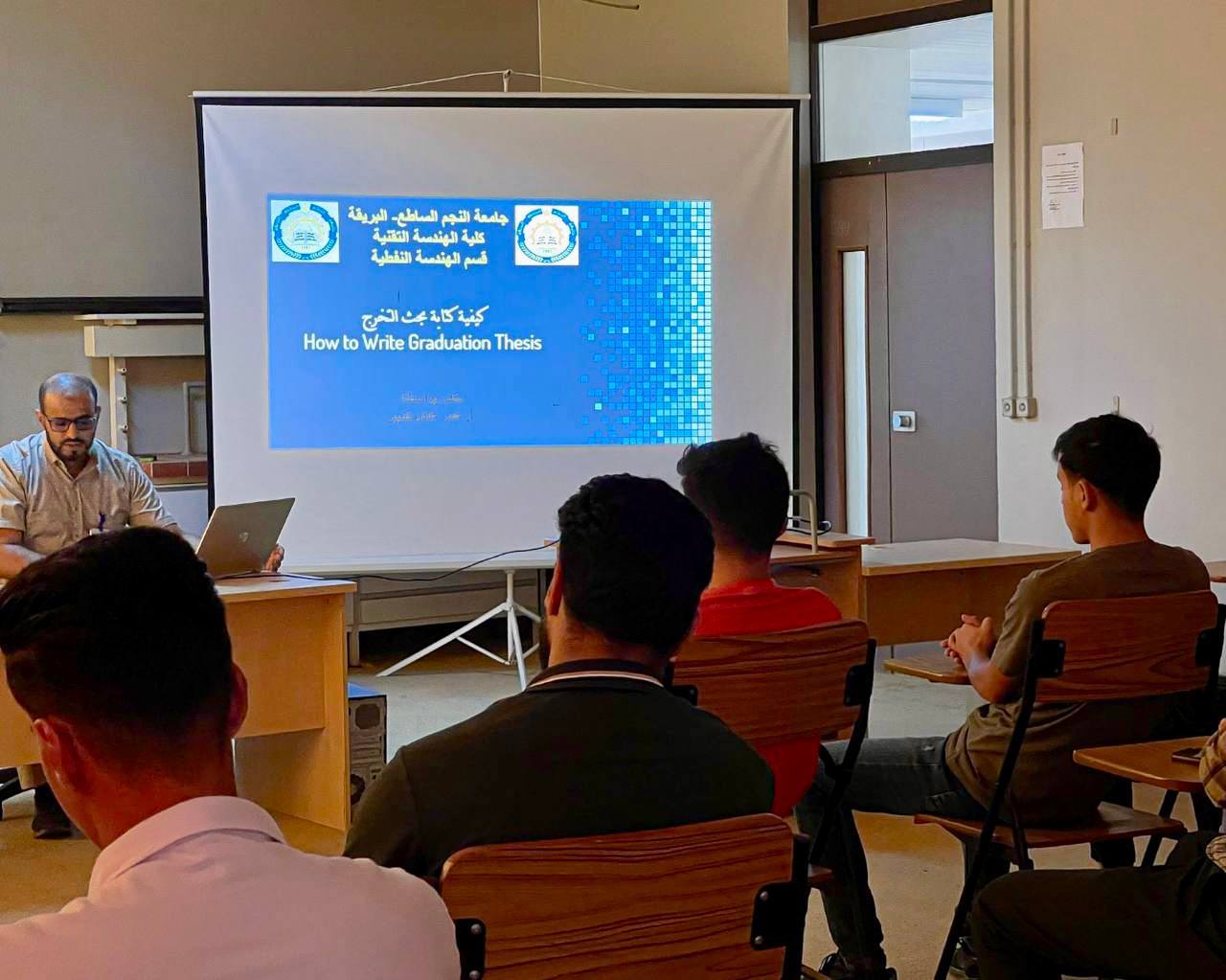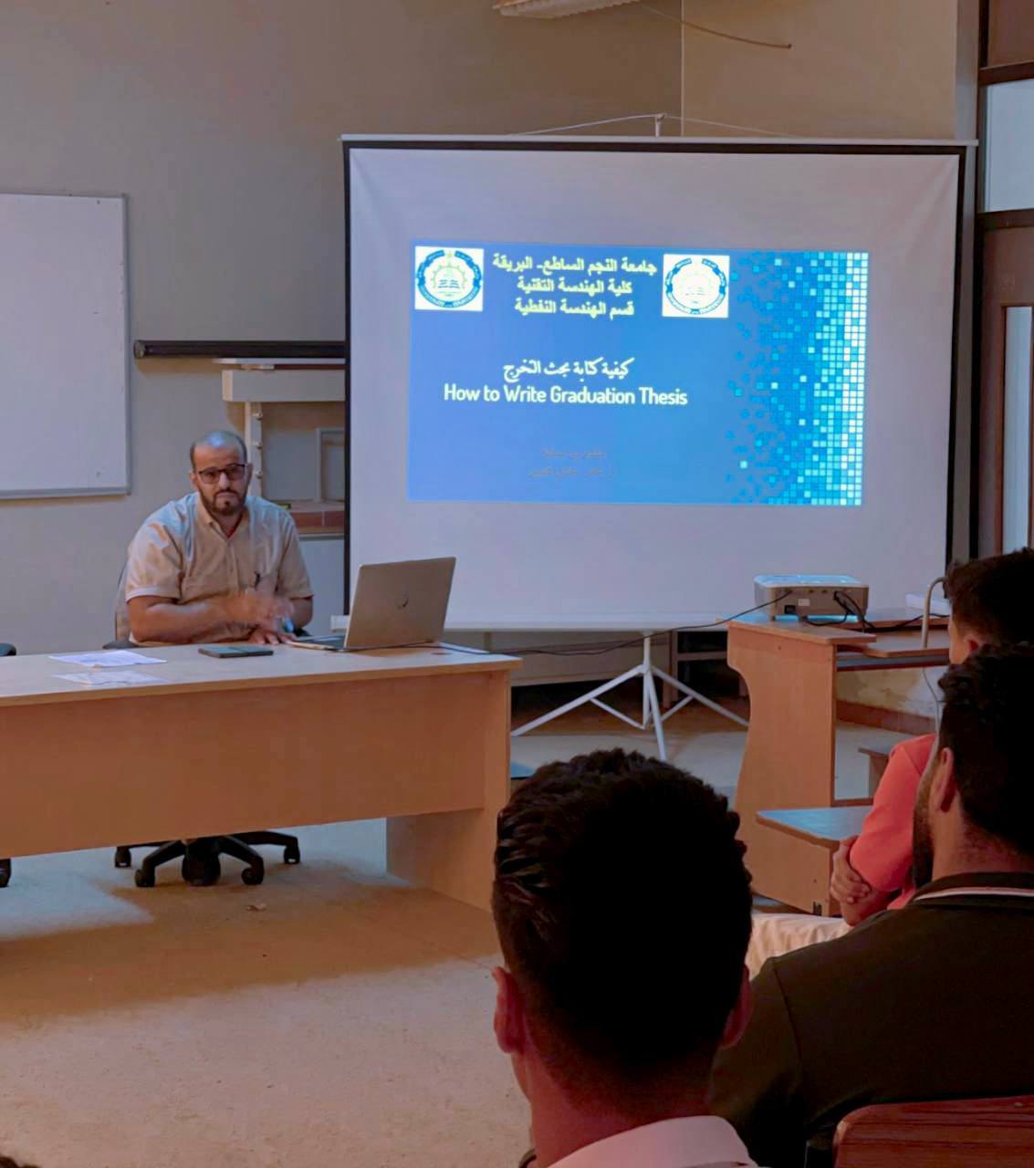 في إطار حرص قسم الهندسة النفطية بكلية الهندسة التقنية على تعزيز ثقافة البحث العلمي وترسيخ مفاهيم الجودة والتميز الأكاديمي، نظم القسم يوم الثلاثاء الموافق 14 أكتوبر 2025 ورشة عمل تعريفية بعنوان «كتابة بحث التخرج»، استهدفت طلبة مقررات المقدمات ومشاريع التخرج.