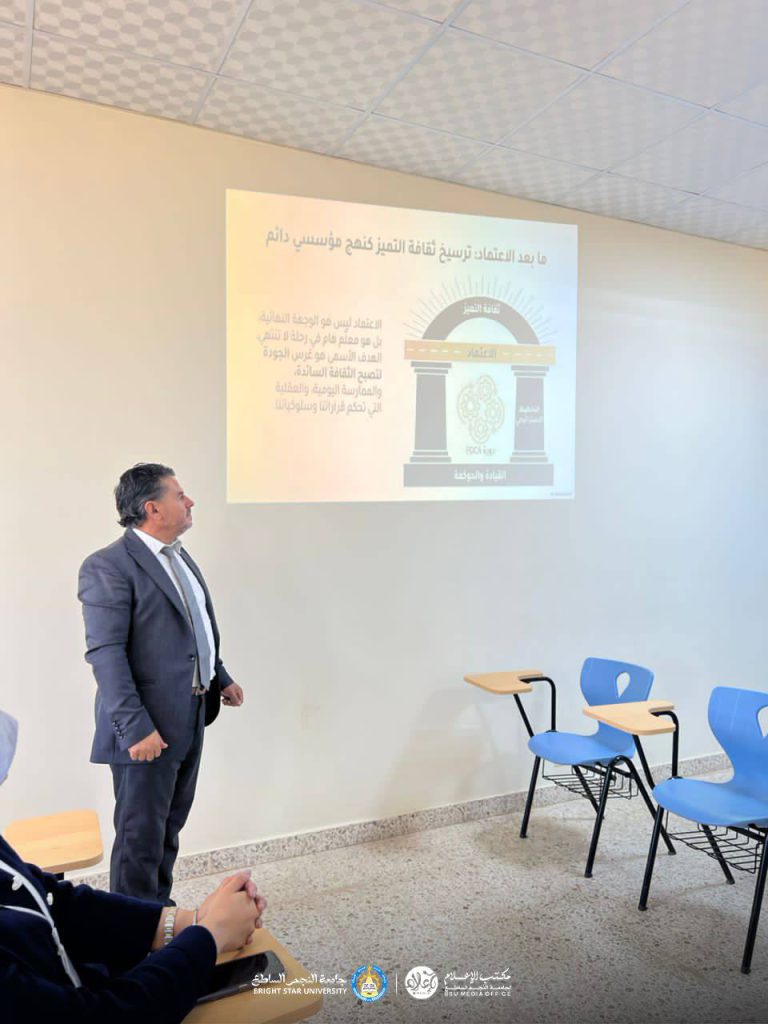 أُقيمت اليوم بجامعة النجم الساطع دورة تدريبية في إدارة الجودة والاعتماد استهدفت موظفي الجامعة، وذلك تحت إشراف إدارة الجودة وتقويم الأداء، وبإلقاء الدكتور صلاح حمد فيتوري.