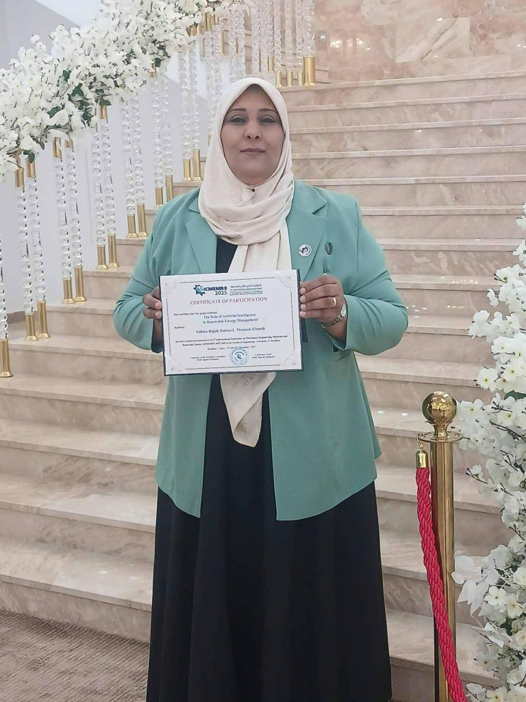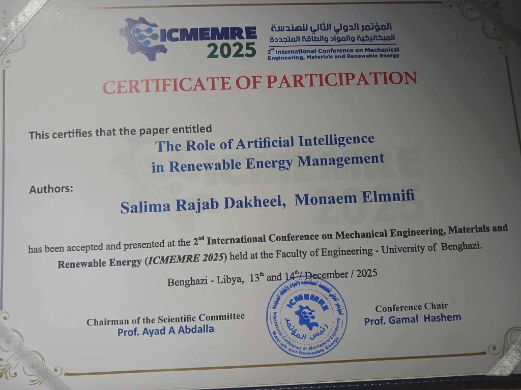 وذلك بالمشاركة مع الدكتور منعم المنفي، حيث تناول البحث أهمية توظيف تقنيات الذكاء الاصطناعي في تحسين كفاءة وإدارة مصادر الطاقة المتجددة، بما يعزز مفاهيم الاستدامة والطاقة النظيفة.